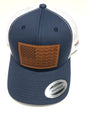 American Cobra/Mustang Stripe on Leather Flag Trucker Hat in Blue with White Mesh, Snap Back